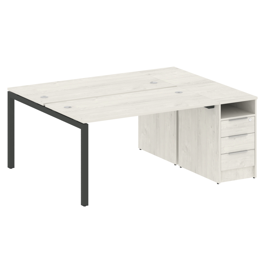 Столешницы имеют отверстия с пластиковыми заглушками кабель-канала серого цвета.