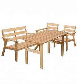 Два продольных распора не позволяют столу раскачиваться. Отверстие в центре стола предназначено для установки зонта, в тени которого ваш отдых станет еще комфортнее. Изделие неокрашенное.