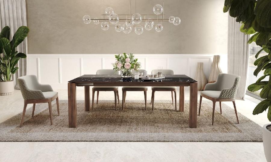 Прямоугольная форма раскладного стола Aron идеально подходит для современных интерьеров, обеспечивая достаточное пространство для комфортного размещения гостей и семейных трапез. Столешница выполнена из глянцевой керамики 6 мм, что придает изделию элегантный внешний вид и делает его устойчивым к царапинам и другим механическим повреждениям. Столешница также обеспечивает легкость в уходе, не требуя особых усилий для поддержания чистоты.
