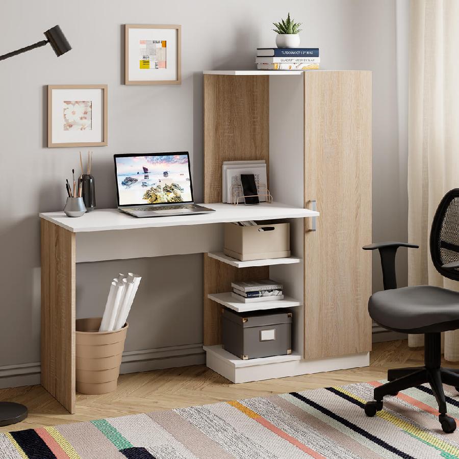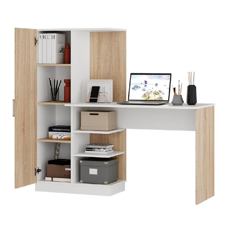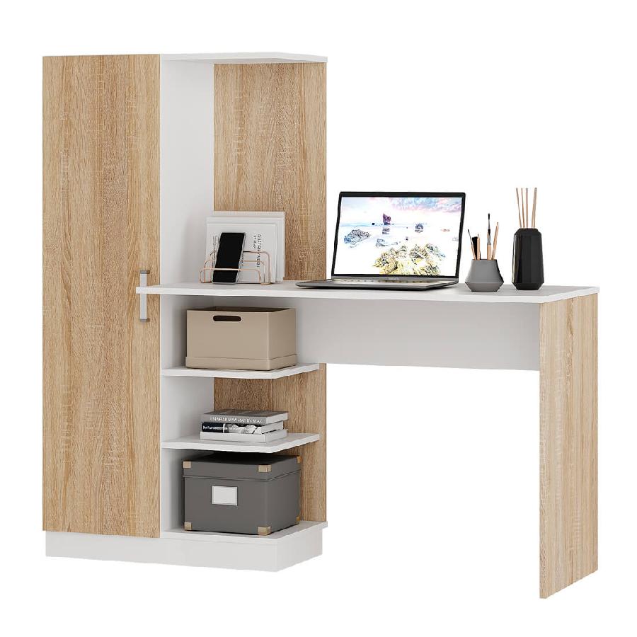 Модель сделана из ЛДСП двух цветов - Белый/Дуб Сонома, благодаря такому цветовому решению, изделие будет выигрышно смотреться в любом интерьере, конструкция модели представляет собой вместительную столешницу, зону с открытыми полками, небольшой пенал с распашной дверцей, в котором можно хранить необходимые для занятий вещи.