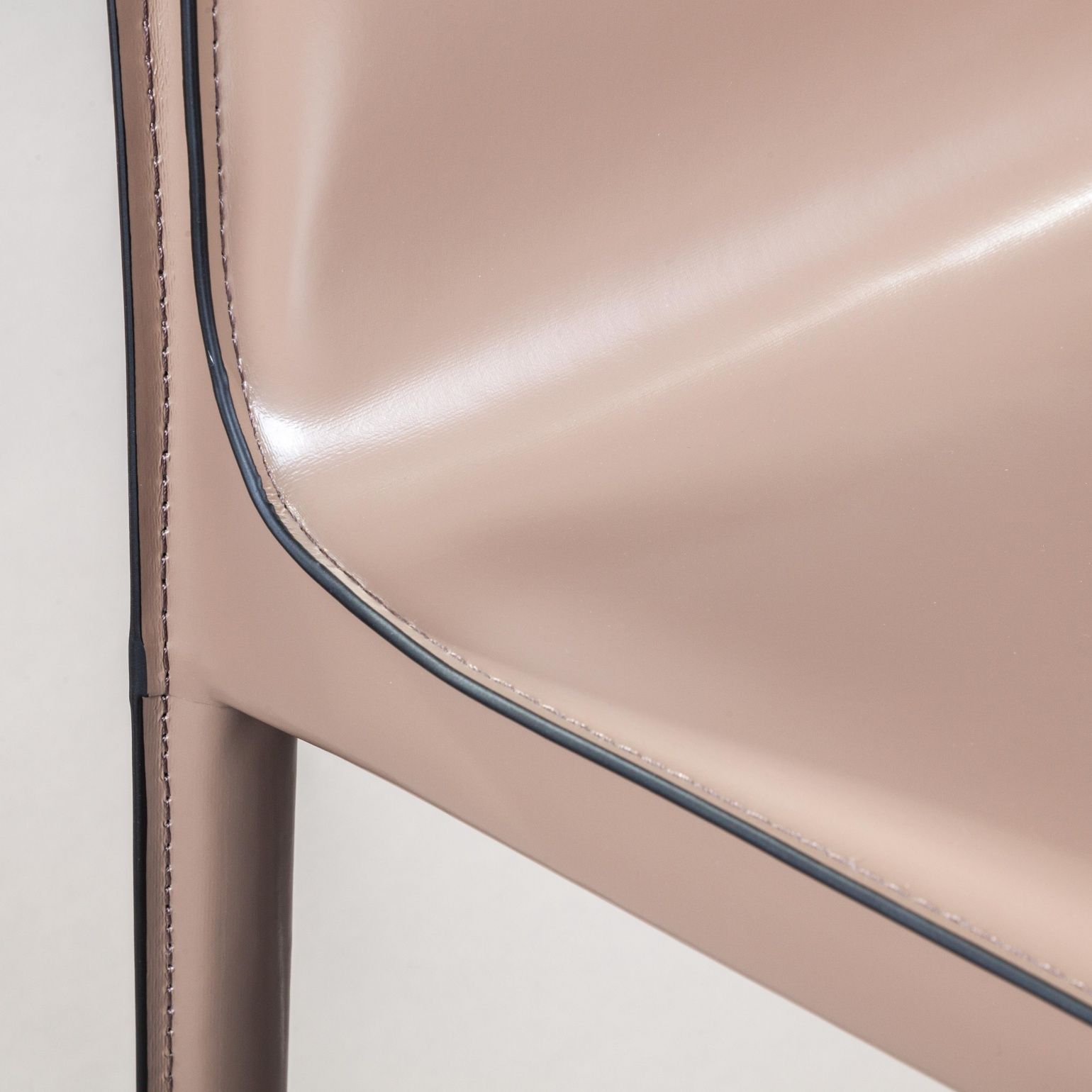Крепкие металлические ножки скрыты под натуральной кожей такого же цвета, как и сам стул, благодаря этому создается лаконичный образ единого целого. На ножках предусмотрены хромированная подставка для ног и специальные пластиковые накладки, которые придают полубарному стулу дополнительную устойчивость и защищают полот царапин.
