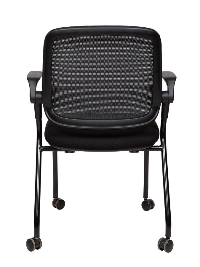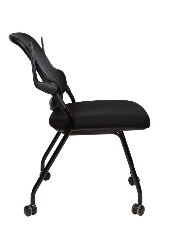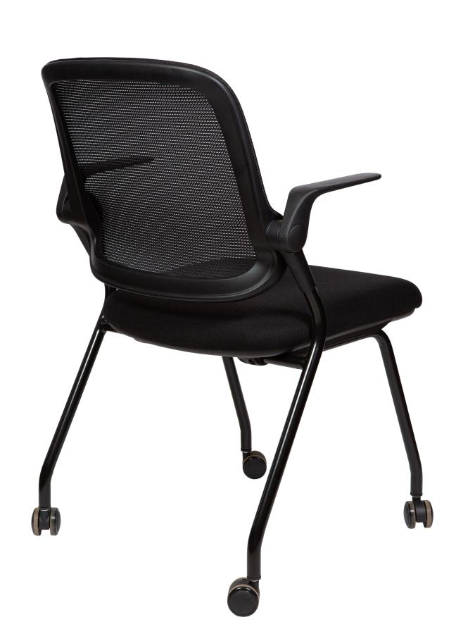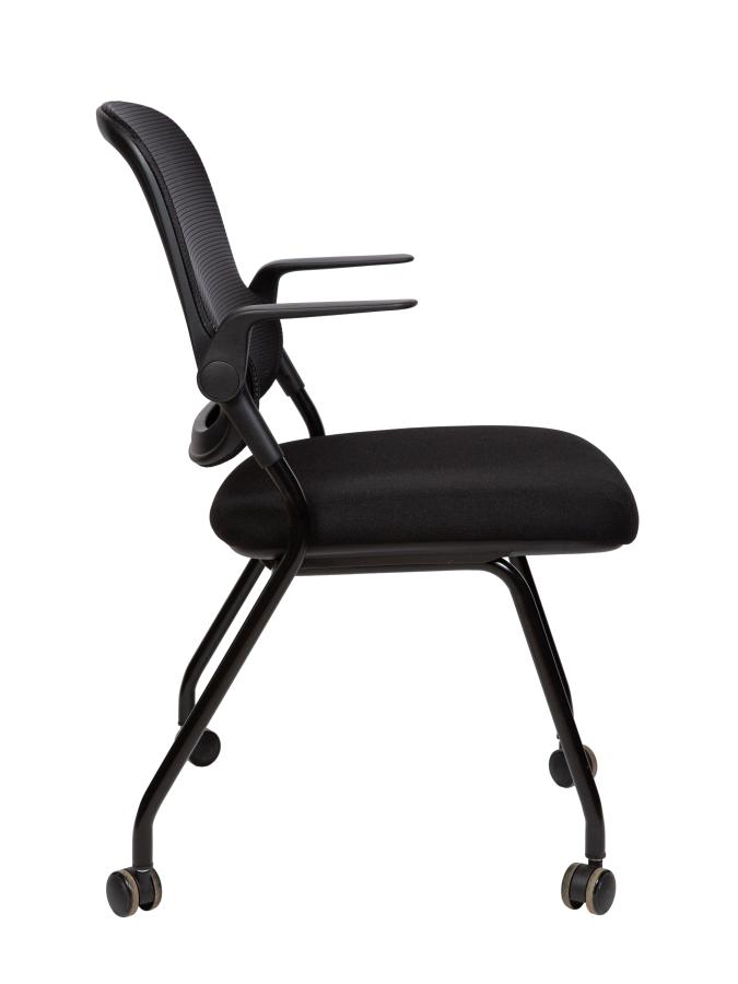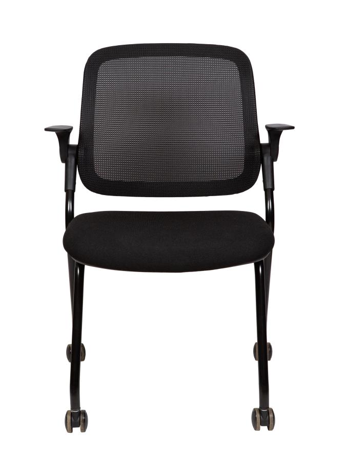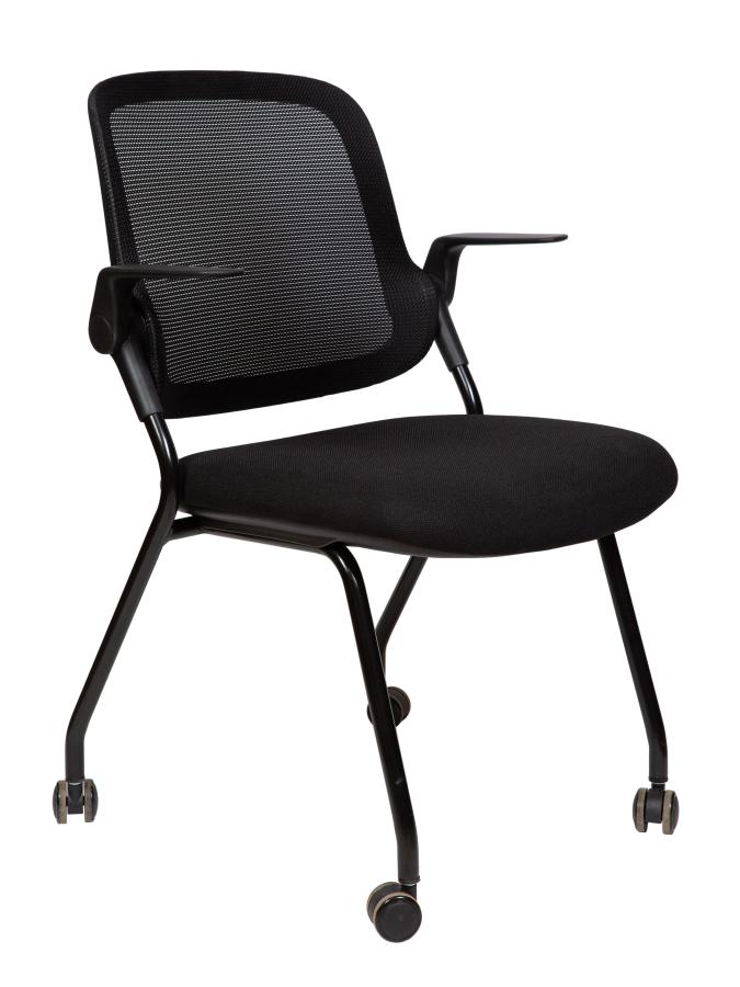 Современный офисный стул для учебных помещений и зон ожиданий. Пластик. Сиденье ткань, Спинка сетка. Цвет пластика черный. Основание металл, черный. Подлокотники поднимаются.