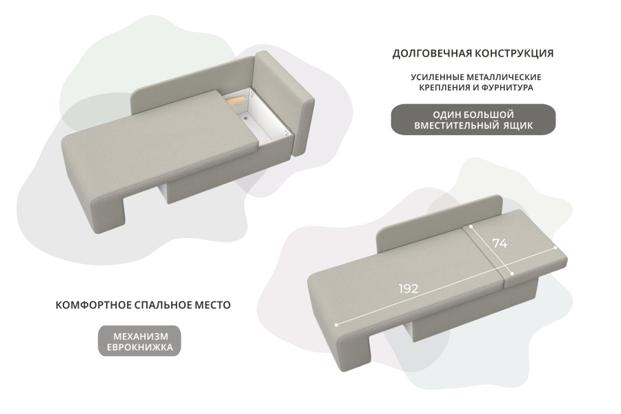 Лаконичные и качественные кушетки со спальным местом для малогабаритных квартир – лучшее решение. Прекрасный вариант –кушетка Лига-097. Дополнительное преимущество - наличие просторного ящика для хранения белья.