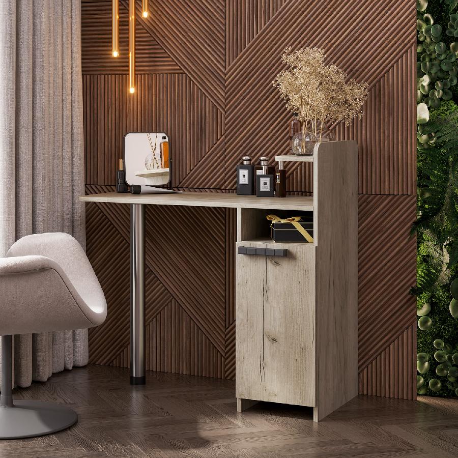 Оснащен тумбой с фасадом и открытой нишей.