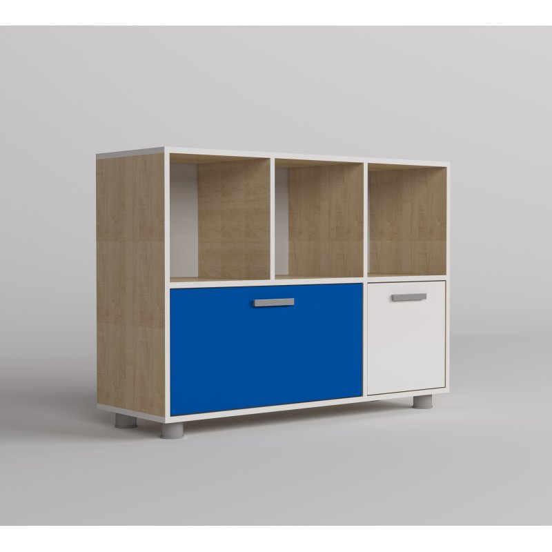 Изделие подойдет для оснащения школьного или офисного кабинета. На полочки можно сложить малогабаритные предметы, книги или элементы декора. Имеется три открытые полочки и две закрытые с откидывающимся вниз фасадом на петлях и газлифтами. Ножки изделия выполняются из износоустойчивого и прочного пластика, благодаря этому они не царапают пол и обеспечивают устойчивость модулю.