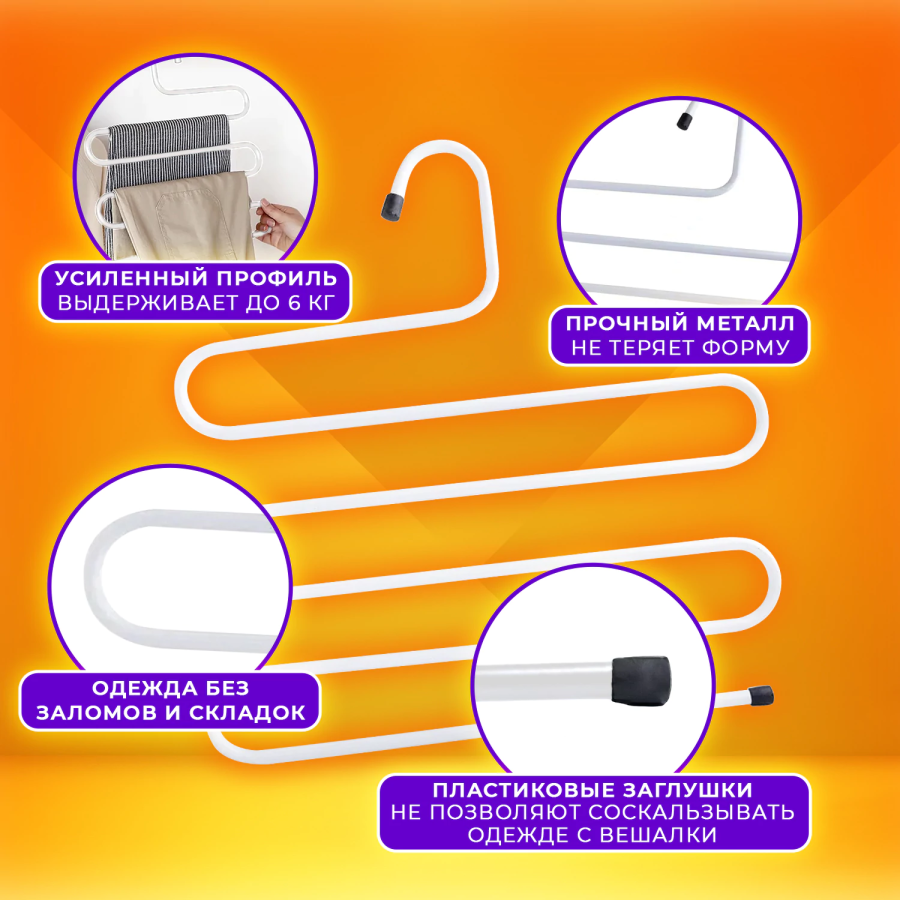 Вешалка для брюк и одежды "ЗМЕЙКА" позволяет повесить большее количество одежды на вешалку, что экономит время и облегчает поиск нужной вещи в шкафу.