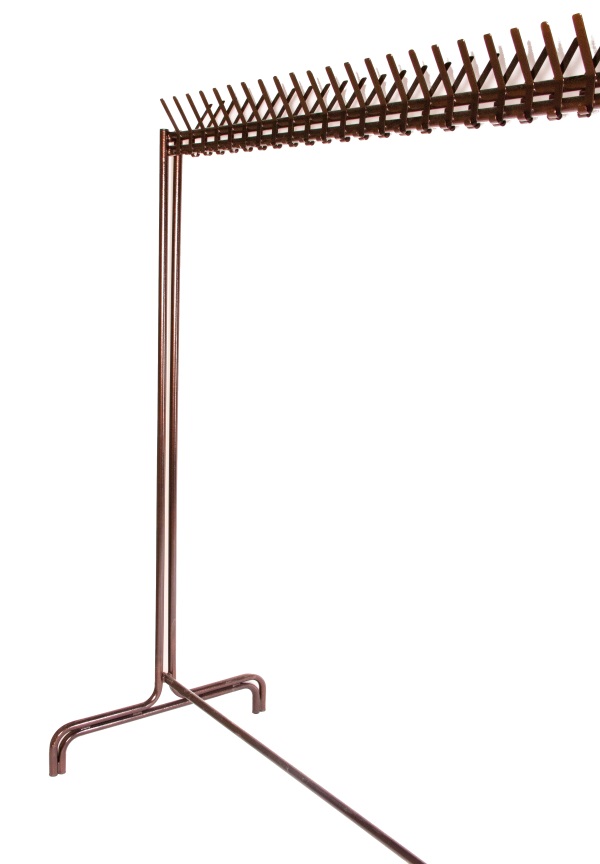 Вешалка предназначена для хранения верхней одежды и головных уборов, которые навешиваются на крючки, расположенные с двух сторон горизонтальной штанги. Каркас вешалки изготавливается из стальных труб диаметром 25 мм или квадратным сечением 25х25 мм. Все металлические детали вешалки покрыты полимерной порошковой краской, цвет – чёрный или серый «металлик» (другие цвета по согласованию). На ножки вешалки могут быть установлены пластиковые заглушки или опорные пластины с отверстиями для анкерного болтового крепления к полу.