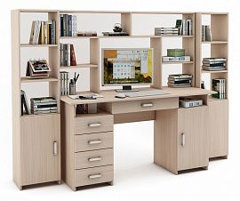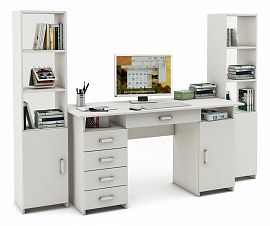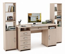 Компоненты, входящие в комплект: надстройка: 3 полки, тумбочка: 1 дверца, 1 полка, тумбочка: 4 ящика, 1 ящик.