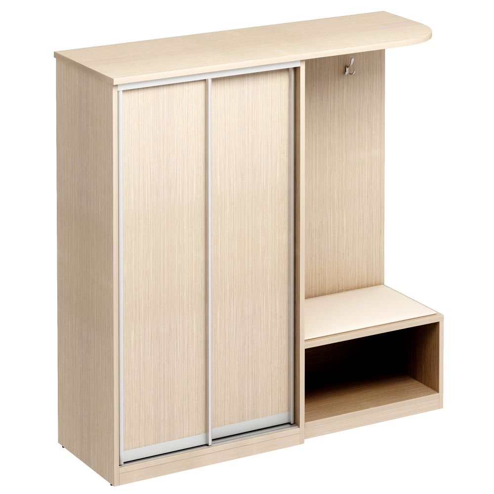 Шкаф-купе комбинированный для одежды и белья – сложносоставная конструкция, состоящая из собственно шкафа-купе, тумбы для багажа и открытой вешалки для одежды. Габариты всей конструкции составляют 201х68х203,7 см, где первая величина – это ширина, вторая – глубина, а третья – высота. Общая ширина складывается из ширины шкафа-купе и ширины тумбы под багаж. Ширина шкафа-купе – 110 см. Его глубина по боковине составляет 65 см. Толщина боковин и нижнего щита шкафа равна 25 мм.