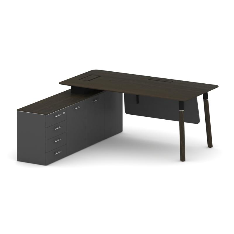 Изысканность кабинета Fresco проявляется в деталях: массив дерева для столешниц и опор сочетается с декоративными элементами из нержавеющей стали. Этот диалог материалов рождает уникальный дизайн на стыке классики и современности, создавая не просто рабочее место, а знаковый предмет интерьера для требовательного руководителя.