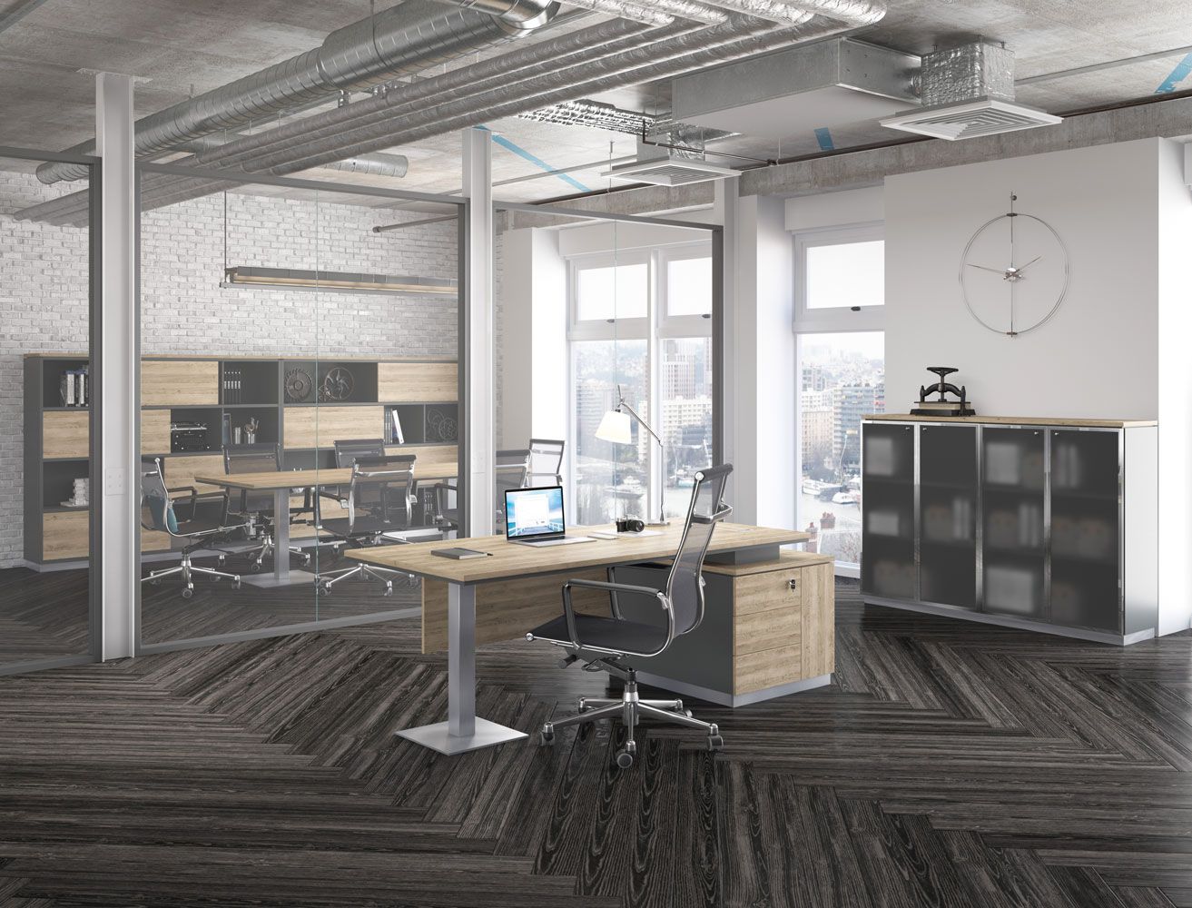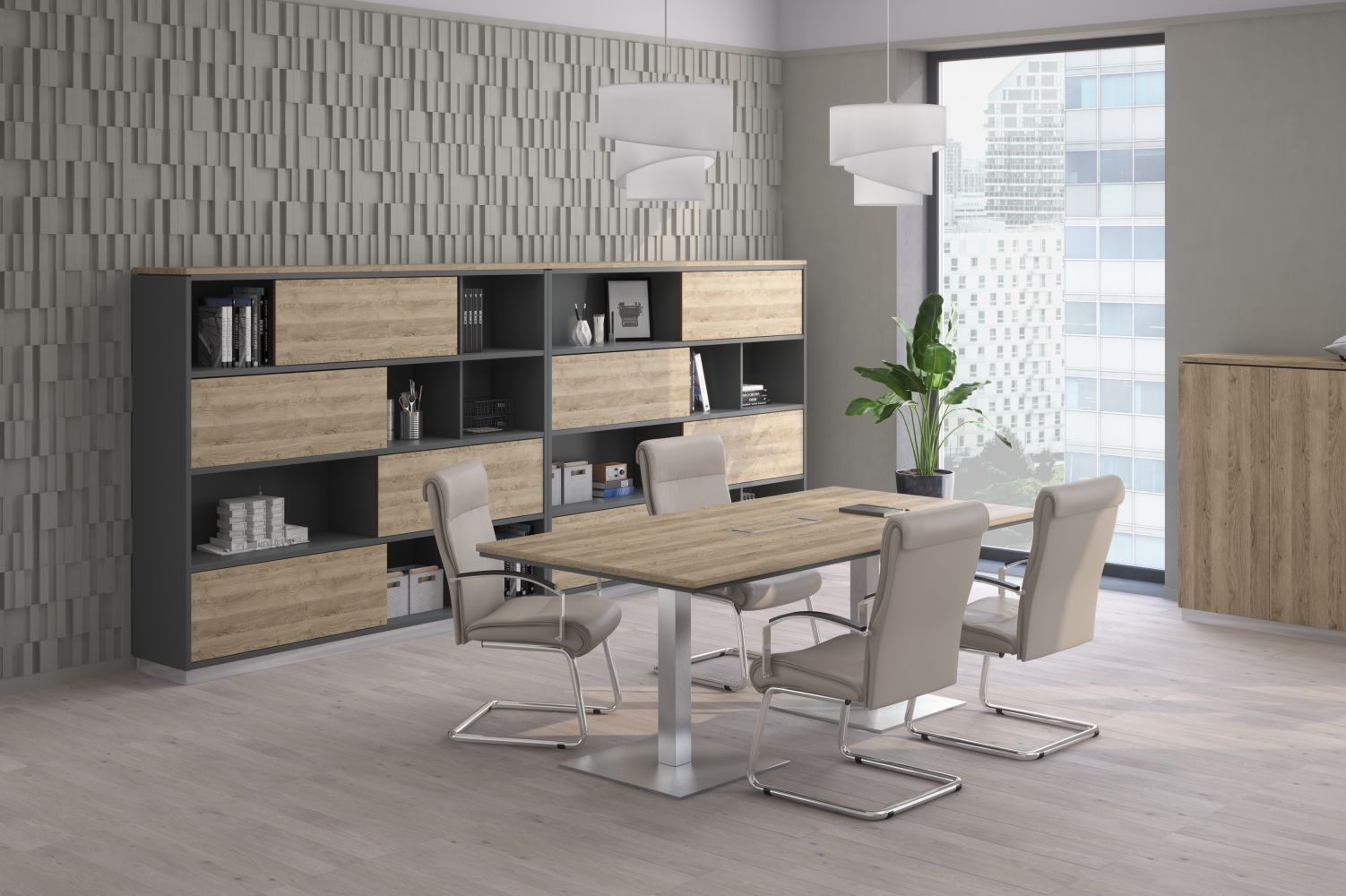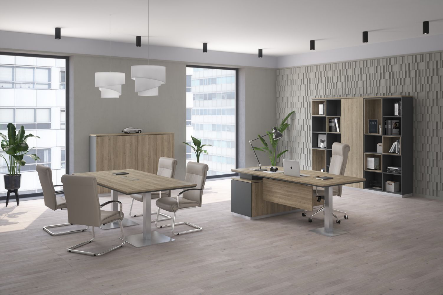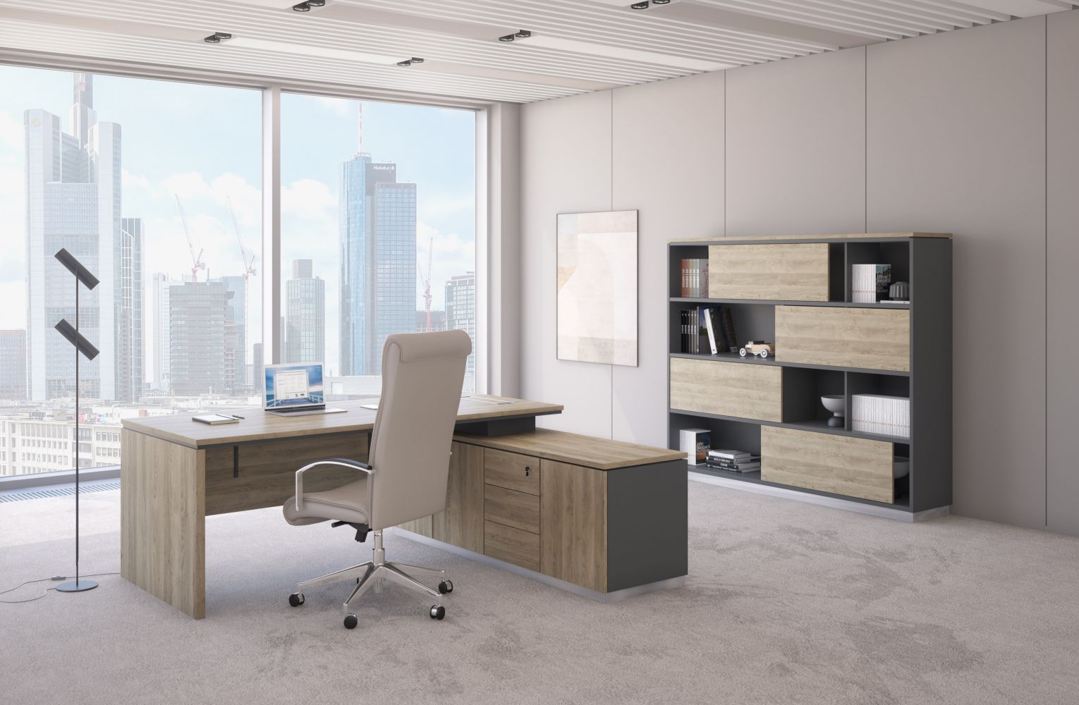 Комбинированные столешницы с нижней частью в цвет корпусов опорных тумб.