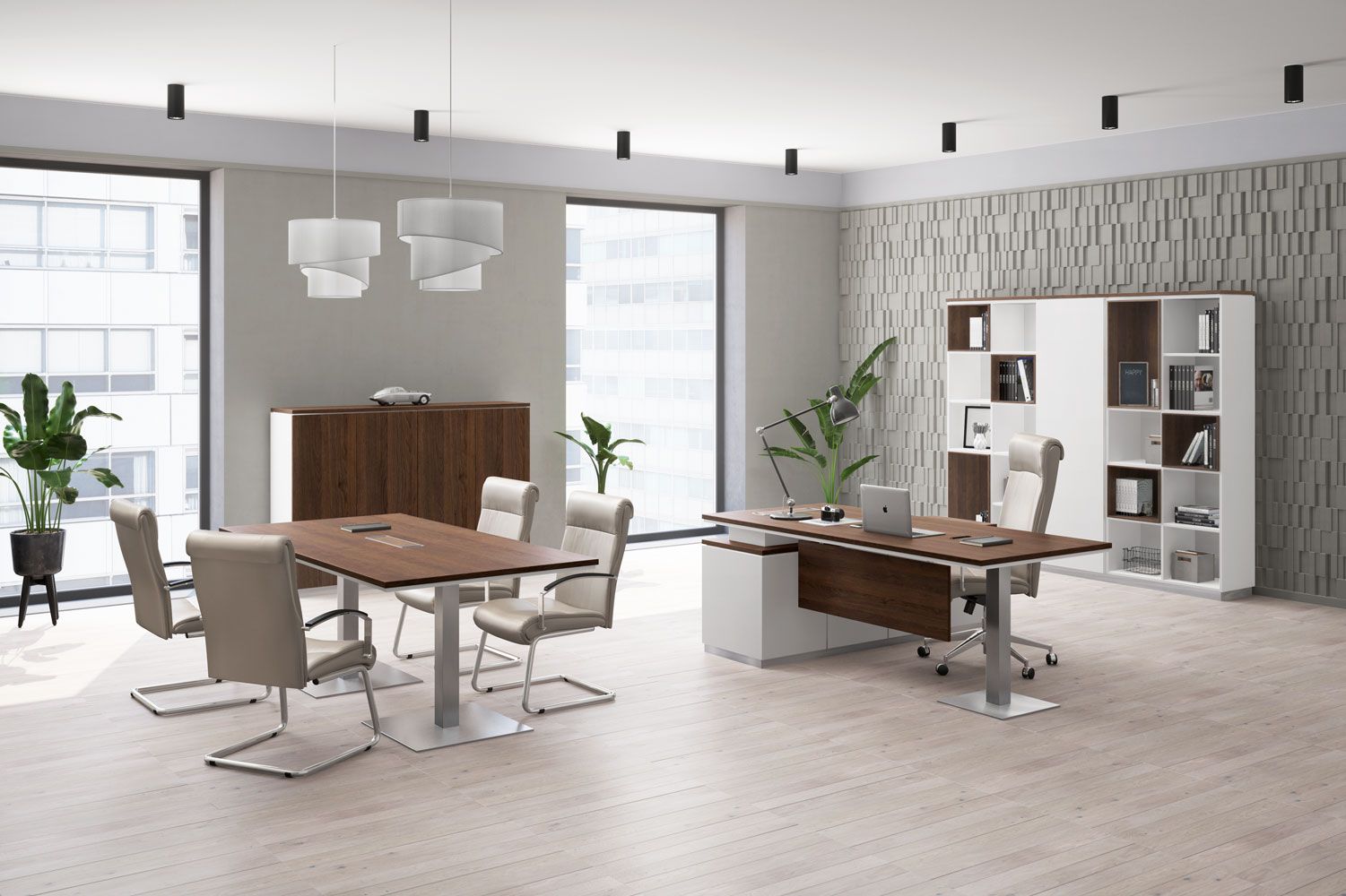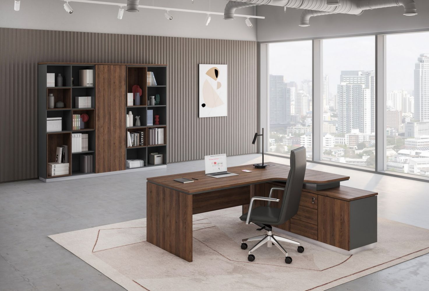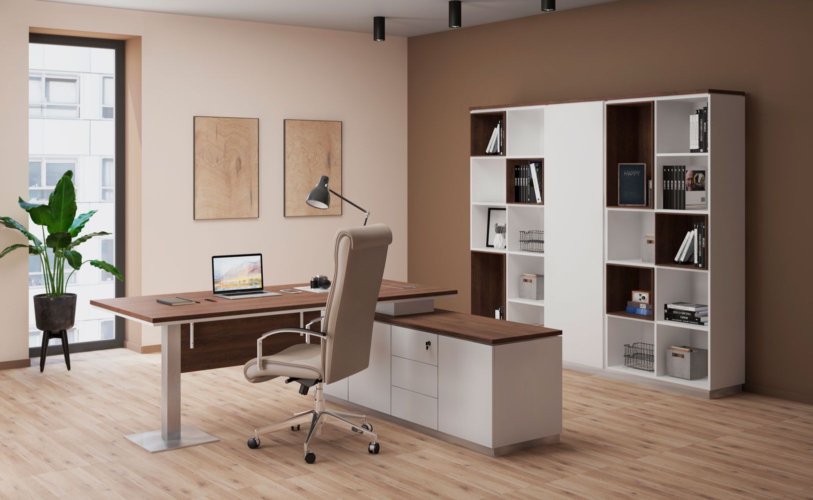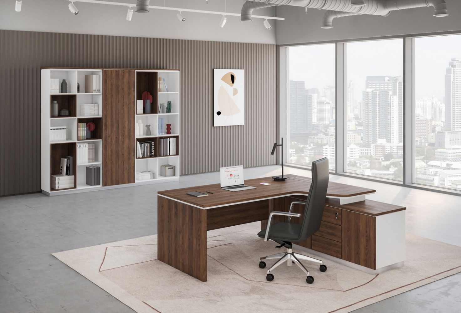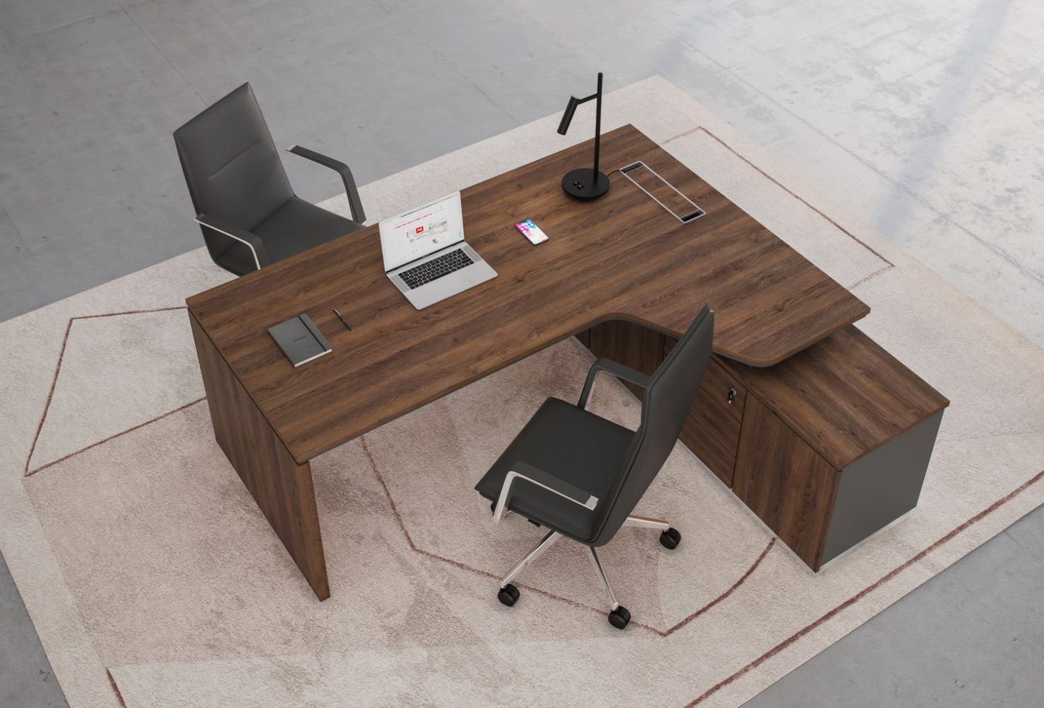 Комбинированные столешницы с нижней частью в цвет корпусов опорных тумб.