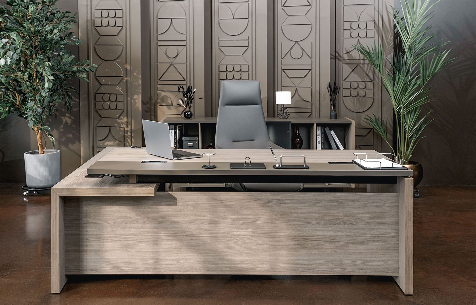 Стол руководителя с кабель-каналами с тумбой подвесной 2-ящичной с замком левый U.RUS РС 113 ДЧ/ЛС дуб виченца/лава серая