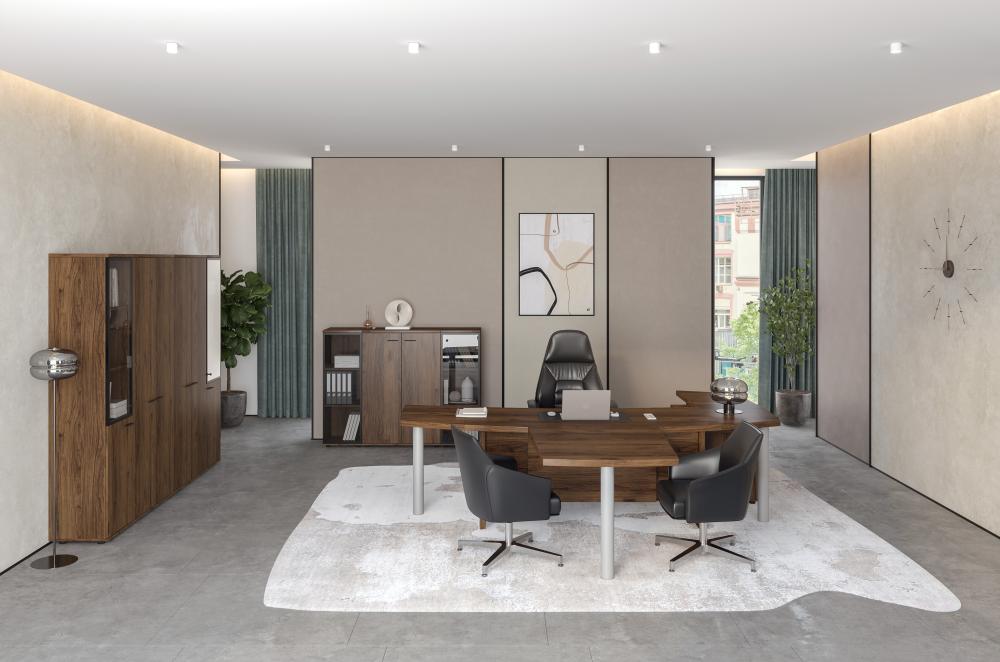 Столешница из ЛДСП 41 мм в форме “крыла” в кромке ПВХ 2 мм. Опоры из ЛДСП 41 мм в кромке ПВХ 2 мм по вертикальным торцам. Передняя панель состоит из двух поверхностей с разнонаправленной текстурой из ЛДСП 16 мм. Видимые вертикальные торцы накладки в кромке ПВХ 2мм.