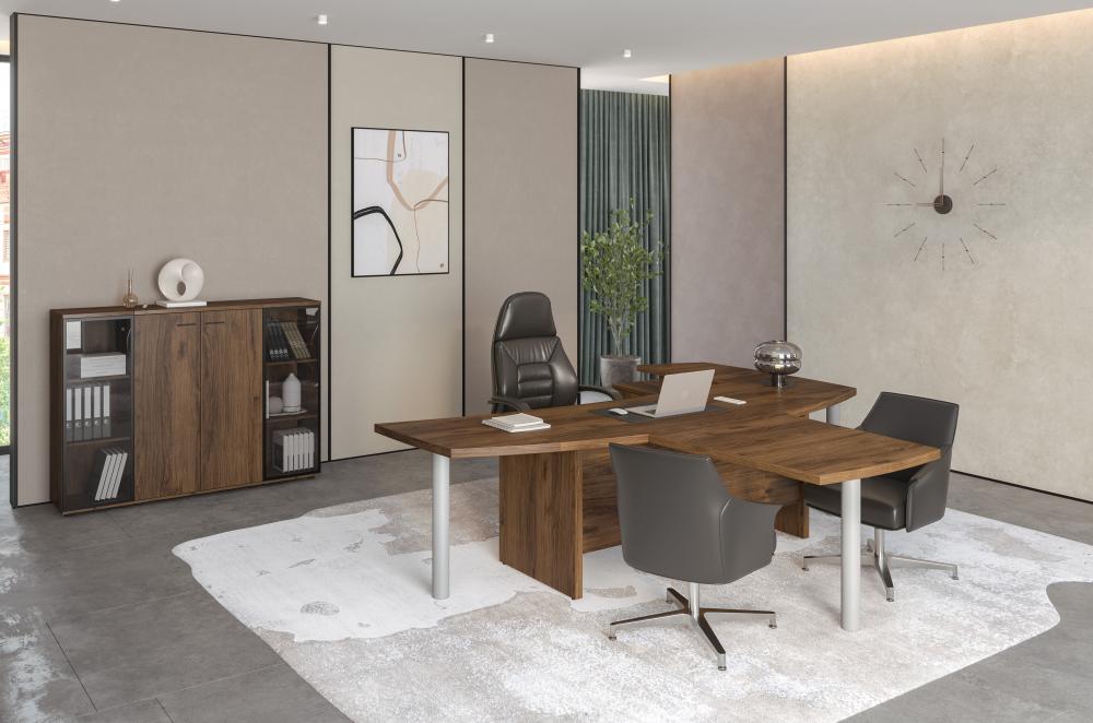 Столешница из ЛДСП 41 мм в форме “крыла” в кромке ПВХ 2 мм. Опоры из ЛДСП 41 мм в кромке ПВХ 2 мм по вертикальным торцам. Передняя панель состоит из двух поверхностей с разнонаправленной текстурой из ЛДСП 16 мм. Видимые вертикальные торцы накладки в кромке ПВХ 2мм.