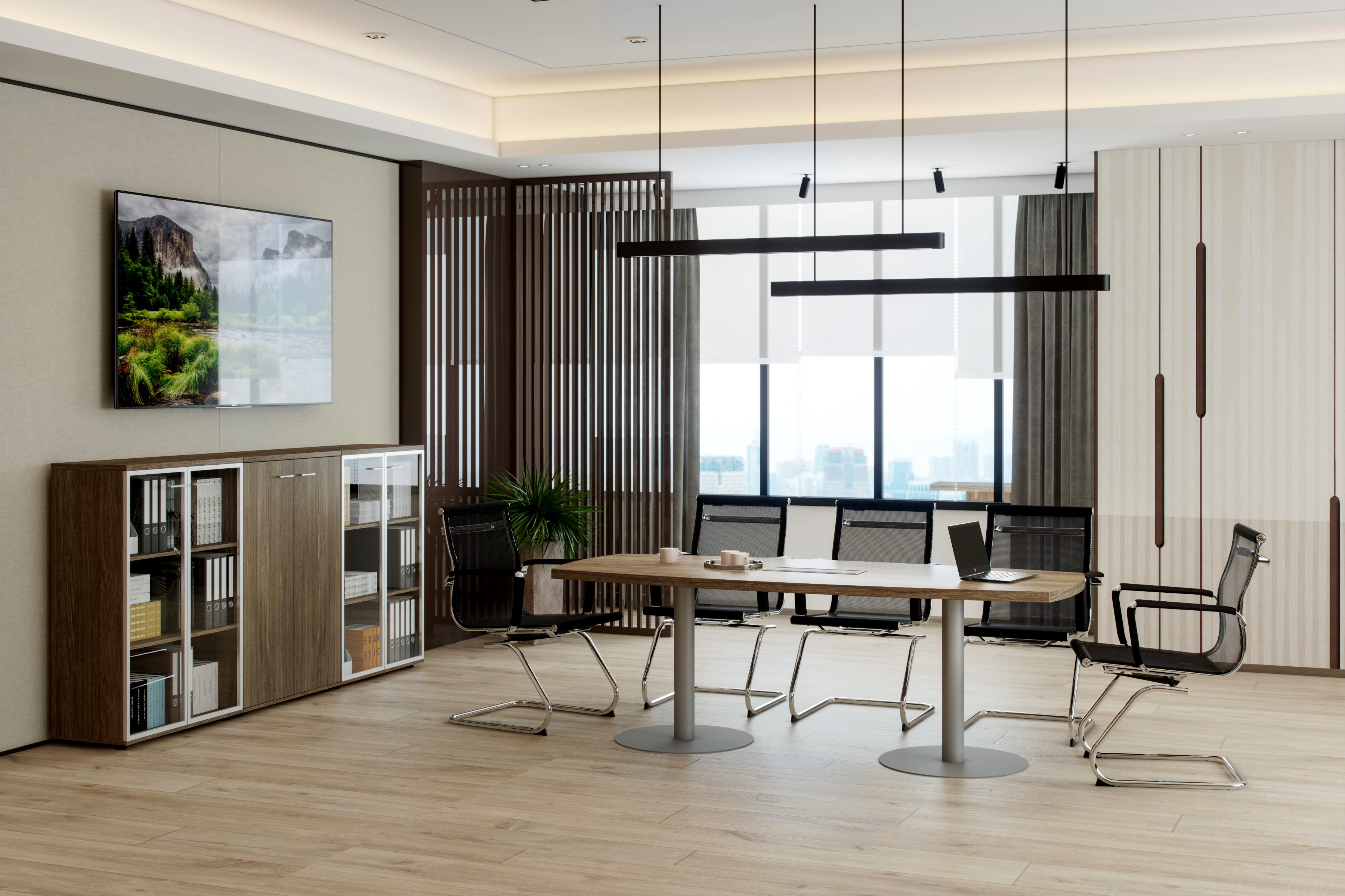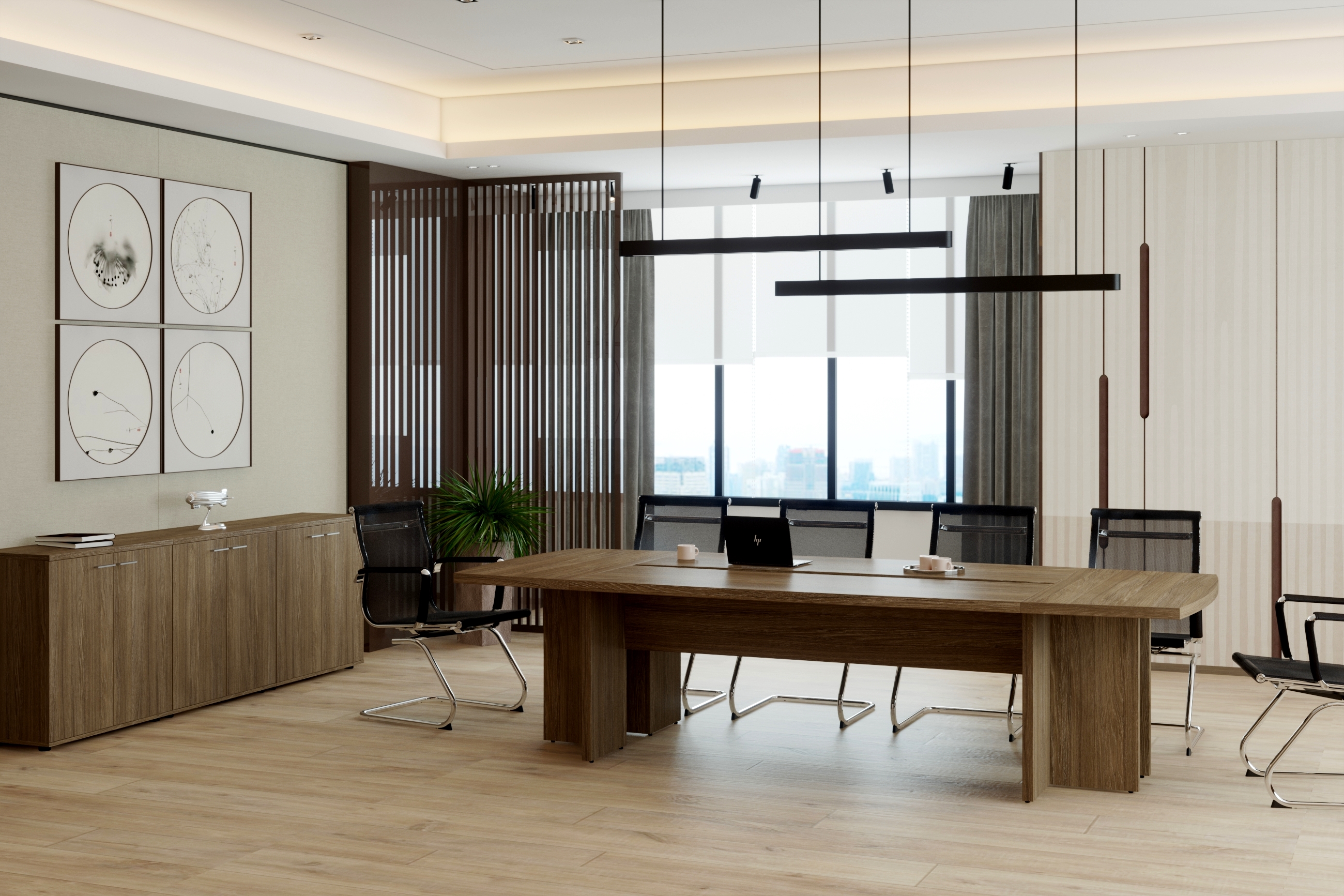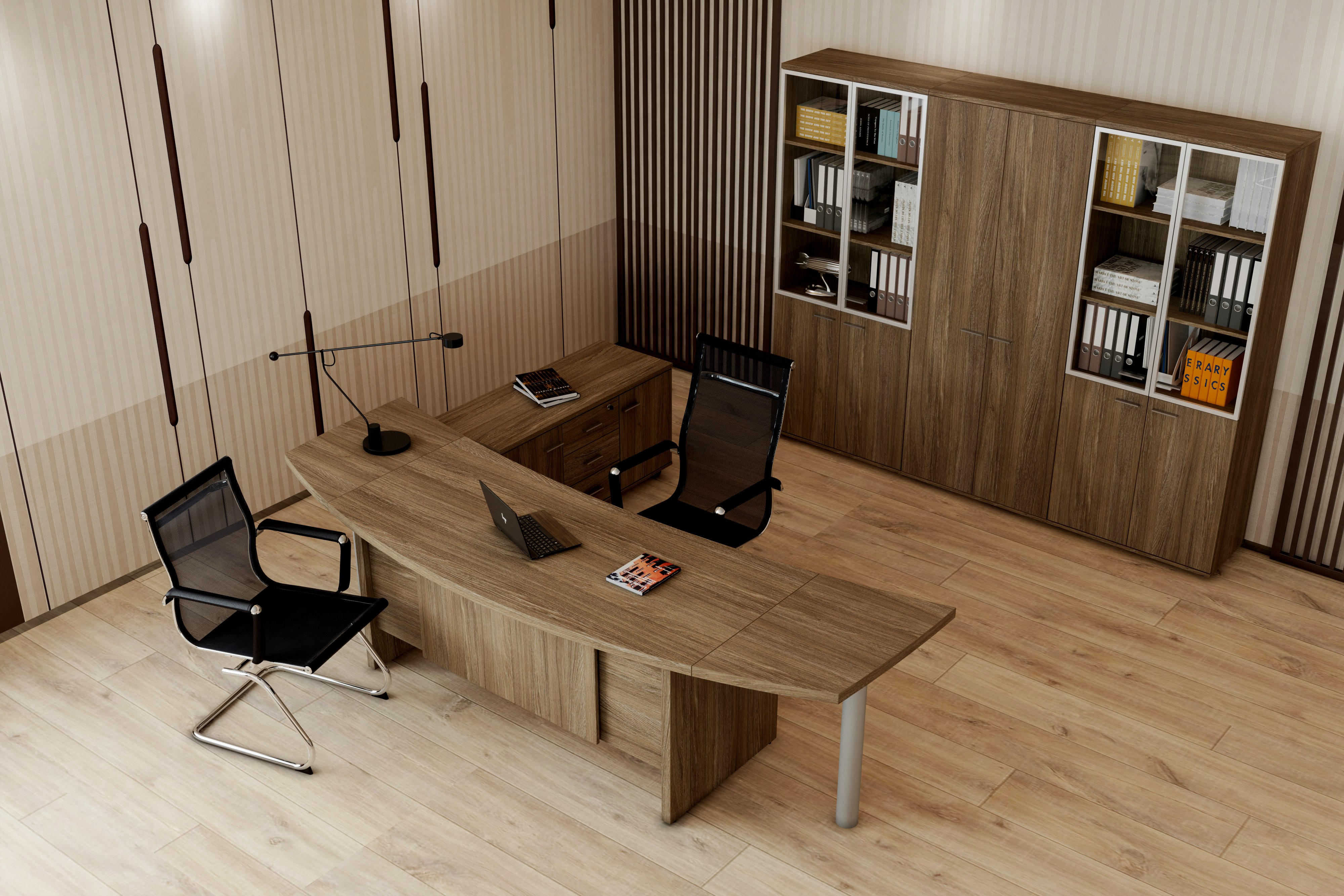 Кабинет WING - это символичное сочетание традиционных материалов для изготовления мебели с уникальными нелинейными формами столешницы кабинет. Кабинет для руководителей WING отражает современные взгляды на офисную мебель. Оригинальный дизайн кабинета подчеркивается уникальной формой столешницы, которая тяготеет к форме крыла. Это не только исключительная особенность дизайна, но и её функциональная составляющая, обеспечивающая присоединение дополнительных рабочих поверхностей в виде боковых приставок нелинейной формы, а также традиционного брифинга.