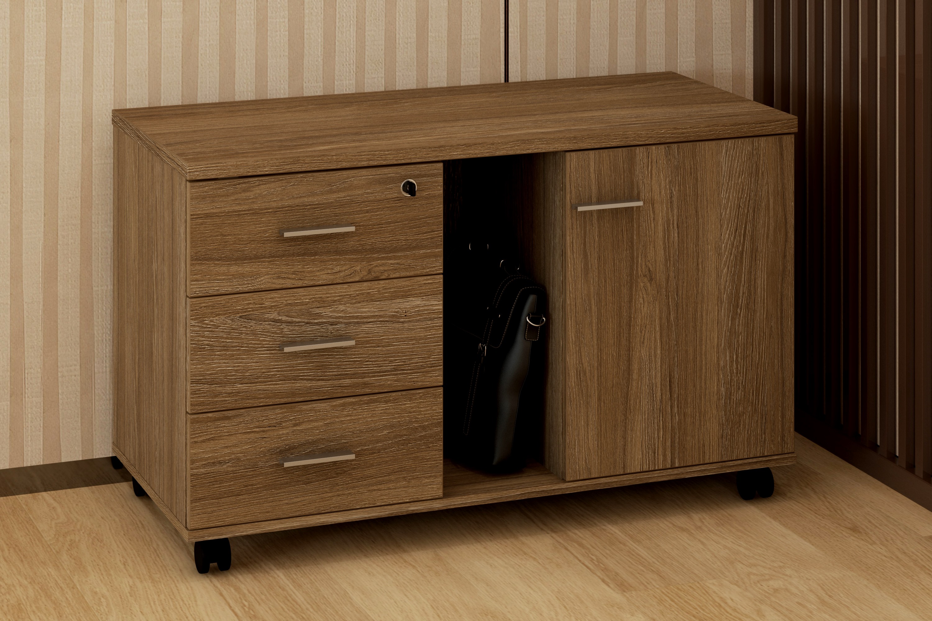 Топ из ЛДСП 25 мм в кромке ПВХ 2 мм по периметру. Распашные фасады, фасады ящиков и корпус из ЛДСП 16 мм в кромке ПВХ 0,4 мм. В комплекте регулируемые опоры или колёса D50. Верхний ящик закрывается на замок. Направляющие роликовые 400 мм цвет белый.