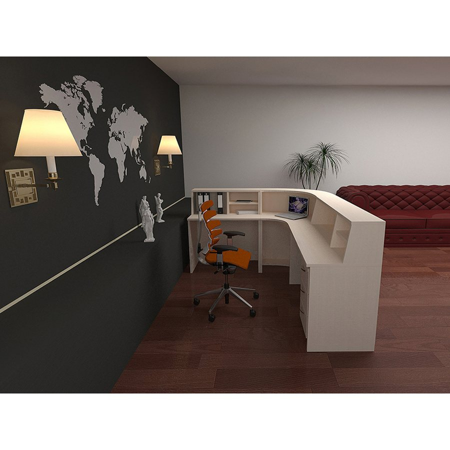 4. Эксплуатационные параметры – стойка ресепшн «Фокус» рассчитана на высокую нагрузку, ей не страшны ультрафиолет, пролитые жидкости, влажная уборка, моющие средства, она стойка к истиранию и царапинам, а ударостойкая кромка повышает износостойкость и долговечность.