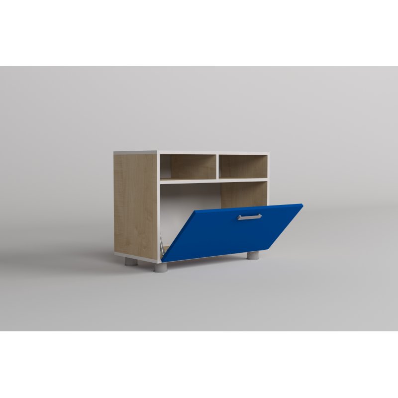 Корпус изготовлен в цвете Клен танзау, а дверца исполняется в ярко-синем, белом, оранжевом или сером цвете. Имеется две открытые полочки и одна закрытая с откидывающимся вниз фасадом на петлях и газлифтами.