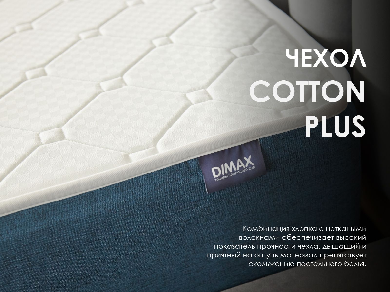 У матраса есть чехол. Он несъёмен и сшит из хлопкового жаккарда. Его подкладкой выступает плотный ППУ, который дарит комфорт спальной поверхности. Жаккард соединён с пеной фигурной стёжкой по всей площади матраса, это придаёт изделию нарядный и пышный вид. Для бурлета подобрана другая ткань – прочная темно-синяя рогожка.