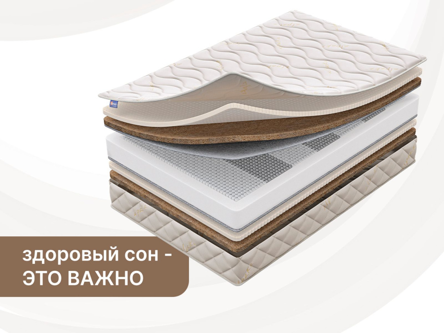 С обеих сторон матраса расположены комбинации слоев койры и натурального латекса. Отличие состоит в порядке расположения плит: с одной стороны - латекс, с другой - кокосовая койра. Такое сочетание наполнителей придает матрасу ортопедические и анатомические свойства: койра поддерживает спину, а латекс позволяет поверхности адаптироваться под форму тела.