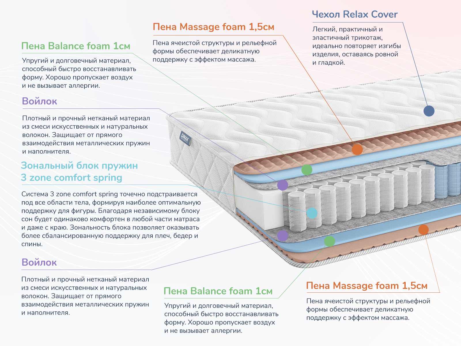 Умеренно-мягкий матрас Relmas Foam 3Zone получил в своё распоряжение крепкий независимый блок пружин, который позволяет переносить нагрузки до 110 кг на спальное место. Модель обладает массажным эффектом, за счёт чего способствует быстрому и глубокому расслаблению.