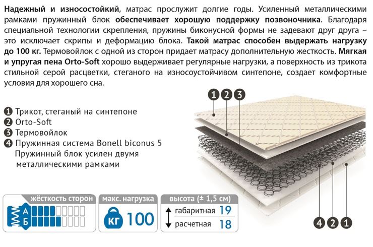 Классический пружинный блок Боннель обеспечивает равномерное распределение нагрузки, обладает высокой выносливостью и прочностью. Матрасы с зависимым пружинным блоком комфортны в использовании, но могут доставлять неудобства партнерам с большой разницей в весе.