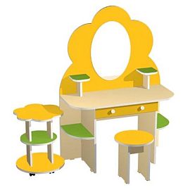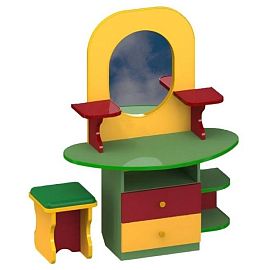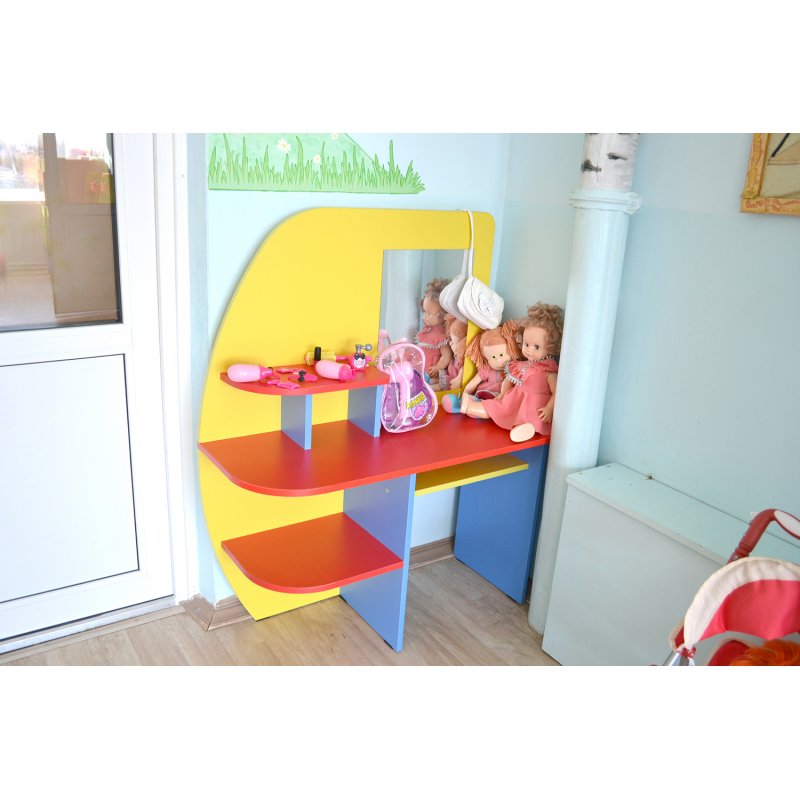 Игровая мебель «Парикмахерская с зеркалом» изготавливается из экологически чистых материалов и лакокрасочных покрытий, что делает уголок не только безопасным, но и привлекательным, достойным украшением игровой комнаты в детском саду.