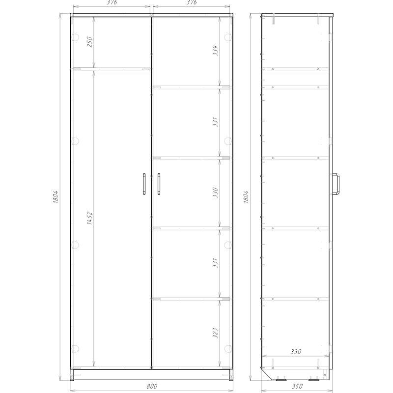 Шкаф предложен в двух модификациях: с одной или двумя створками. Оба варианта оснащены полочками с одной стороны и подвесными крючками с другой. В шкафу можно разместить ведро, швабру, тряпки, чистящие средства, спецодежду.