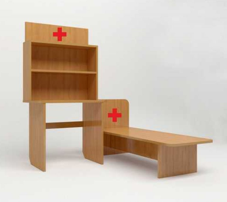 Уголок игровой для детского сада состоит из 2х предметов - стол и кушетка. Оформление уголка напоминает кабинет врача. Стол оборудован полками для игровых принадлежностей «доктора» и ящиком, стилизованным под медицинскую аптечку, куда можно разместить лекарства. Также к столу прикреплён ростомер, с помощью которого можно измерить рост куклы и даже детей (шкала ростомера до 140см). На кушетку можно уложить «больную» куклу или усадить ребенка - измерить температуру, провести различные процедуры. Игры в уголке закрепят знания о труде взрослых, о профессии врача и медицинской сестры.