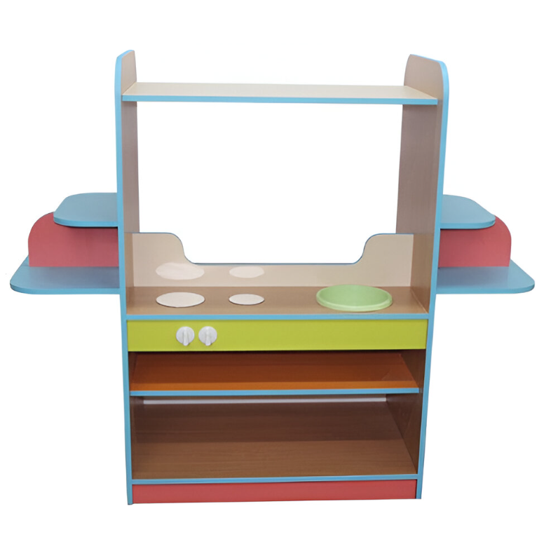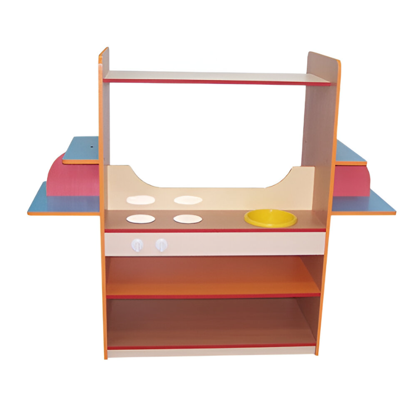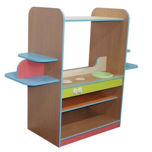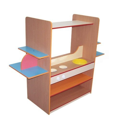 Описание: Основной цвет бук или кремовый. Фасады цветные по желанию заказчика, полочки, перегородки цветные. Стеллаж с двумя полками внизу: со стороны "клиентов" они закрыты. Стеллаж по столешнице разделен на две части, со стороны "продавца" - стилизованные конфорки, выключатели и мойка. В верхней части стеллажа - полка. По обеим краям стоек - две полочки на консолях, верхняя полочка меньше размера.