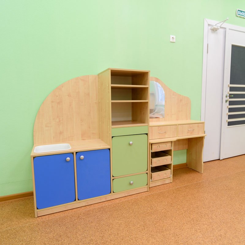 В этом ярком и красочном уголке-кухне отлично повторяются основные элементы кухни: плита, духовка, шкафчики и полочки для посуды. С помощью этого набора игровой мебели дети легко примерят на себя взрослые роли. Уголок-кухня «Хозяюшка» изготовлен из качественной, экологичной ЛДСП привлекательных цветов с использованием безопасной мебельной фурнитуры. Этот набор игровой мебели отлично впишется в интерьер детского сада, подобно остальной мебели производства нашей фабрики детской мебели.