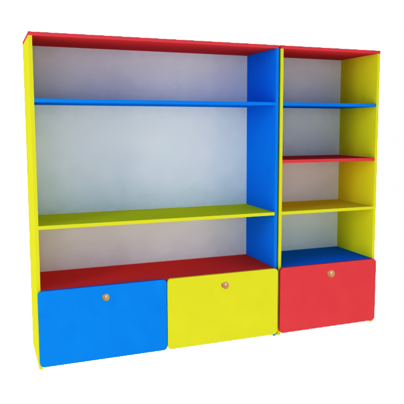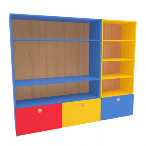 Цветные шкафчики этого стеллажа не только привлекают внимание детей, но и помогают развивать цветовосприятие у малышей. Это очень удобный шкаф для детского сада со множеством полок для игрушек. Выполнен из ЛДСП 16мм, все углы скруглены, кромка ПВХ - 2мм.