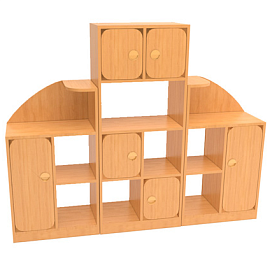 Практичная и функциональная стенка для детского сада. Имеет много открытых полок в легкой доступности для детей. Подойдет для детских садов где нет много места для мебели.