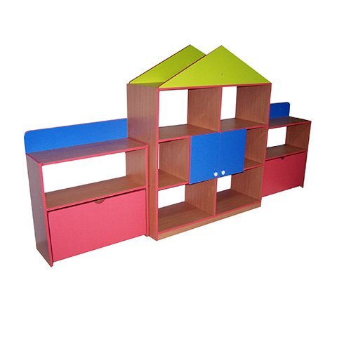 Описание:основной цвет бук или кремовый. Фасады цветные по желанию заказчика. Стенка разделена на три секции, первая и третья одинаковые, разделены пополам, внизу выдвижной ящик на колесиках, у верхней полки низенькая задняя стенка из цветного ЛДСП. Средняя секция сделана в виде теремка, посередине шкафчик с двумя цветными дверками, рядом, вверху, и внизу открытые полки. Крыша в виде 2-х треугольников над самой верхней полкой.
