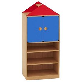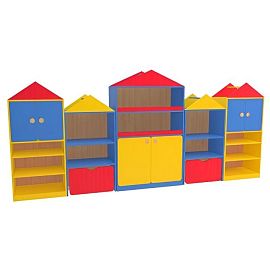 Детская стенка стилизована под домики, поэтому гармонично впишется в интерьер детского сада. Яркие цвета ламинированной ДСП, используемой при изготовлении, обязательно создадут радостное и озорное настроение в игровой комнате.