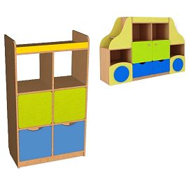 Много функциональный стеллаж для детского сада "Автомобиль", минимальный комплект из 3 модулей:  1 модуль-левый, 2 модуль - средний, 3 модуль - правый, есть возможность добавить несколько модулей №2 - получится лимузин. Стеллаж служит как для хранения  игрушек, так и для пособий и книг. Все элементы стеллажа выполнены из ЛДСП и имеют скруглённые углы, обивка пуфа -  мебельная ткань.