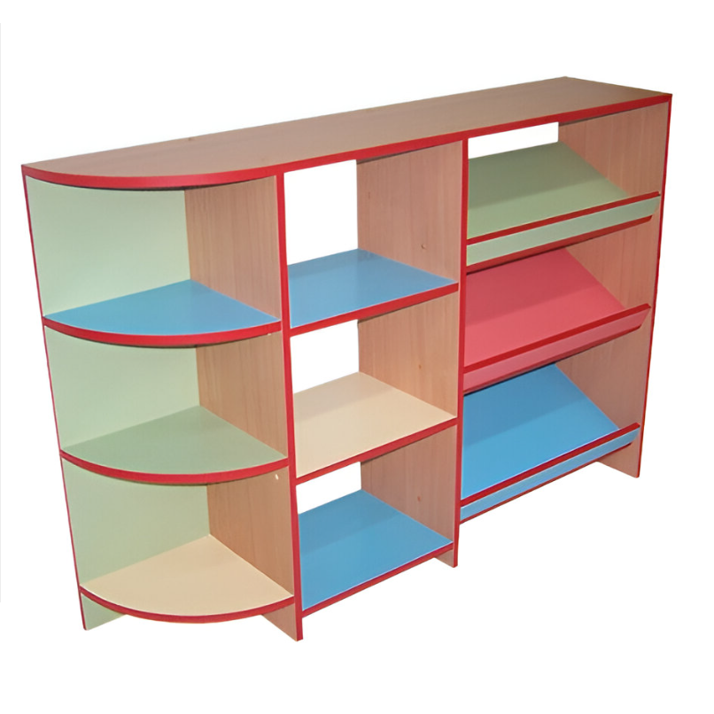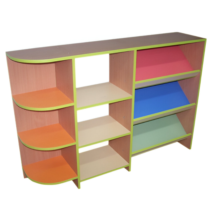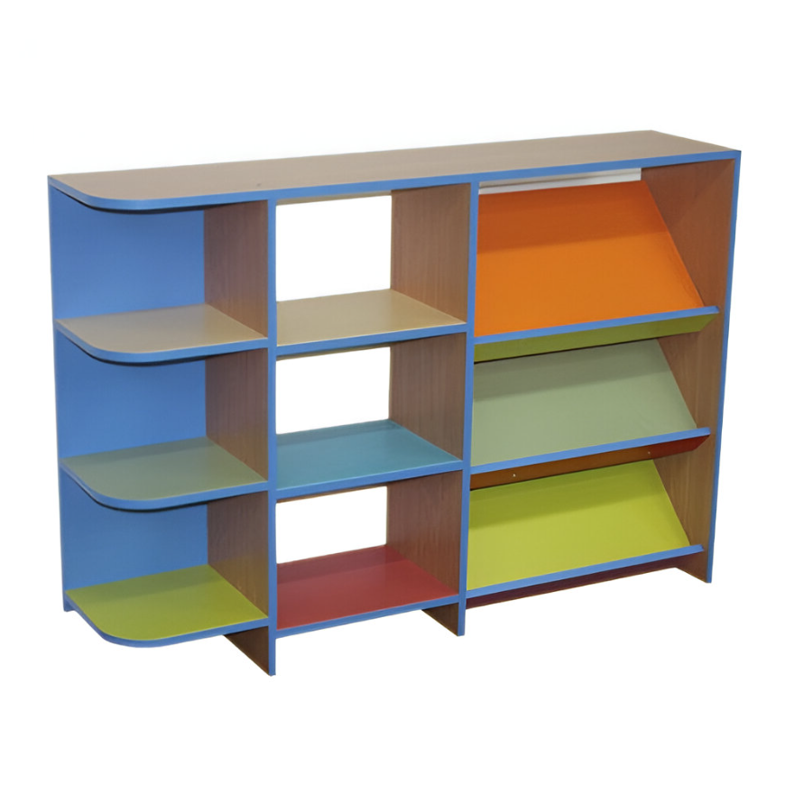 Описание: Основной цвет бук или кремовый. Фасады цветные по желанию заказчика. Первая часть стеллажа состоит из трех наклонных полок с бортиком. Вторая часть - с тремя открытыми полками, третья часть - сегмент с тремя полками.