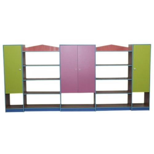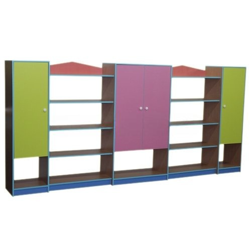 Описание: Шкаф стенка для пособий представляет собой два узких стеллажа, шириной 41 см., и среднего широкого стеллажа, размером 80 см., соединенных между собой пятью полками, шириной 80 см. Основной цвет бук или кремовый. Фасады цветные по желанию заказчика. Крайние стеллажи с глухими дверками, закрывающими три верхние полки высота каждой 34 см., нижняя полка открытая. Средний широкий стеллаж с двумя глухими дверками на три верхние полки, нижняя полка открытая. Стеллажи имеют заднюю стенку из МДФ, соединительные полки без задней стенки. Верхние соединительные полки со стороны стены имеют бортик из цветного ЛДСП в форме треугольника. Для сохранности покрытия пола стеллажи устанавливаются на пластиковые подпятники.