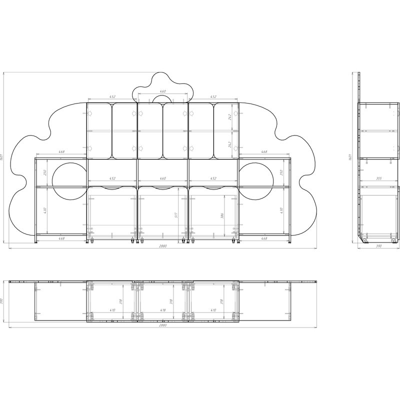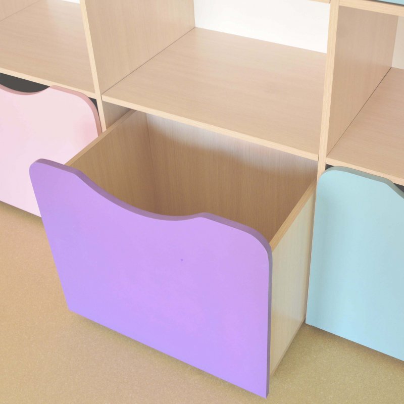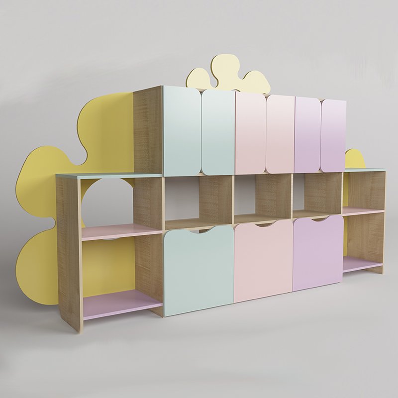 Он изготавливается в приятных, успокаивающих, пастельных тонах. Имеет множество секций: как открытых, так и закрывающихся дверцами.