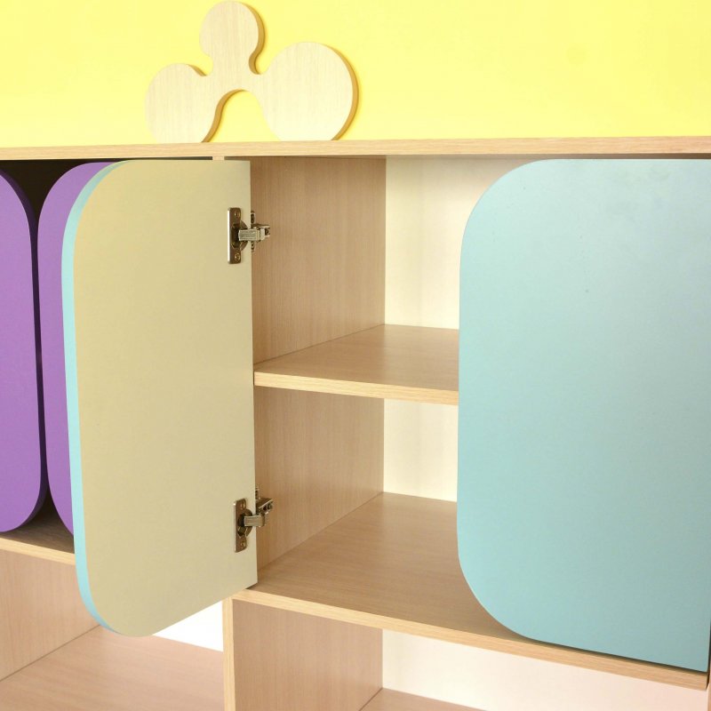 Его плавные линии – это не только элемент дизайна, но и безопасность для детей. Кроме того, дверки стеллажа не имеют ручек, а, значит, у предмета мебели нет частей, о которые может больно стукнуться малыш.