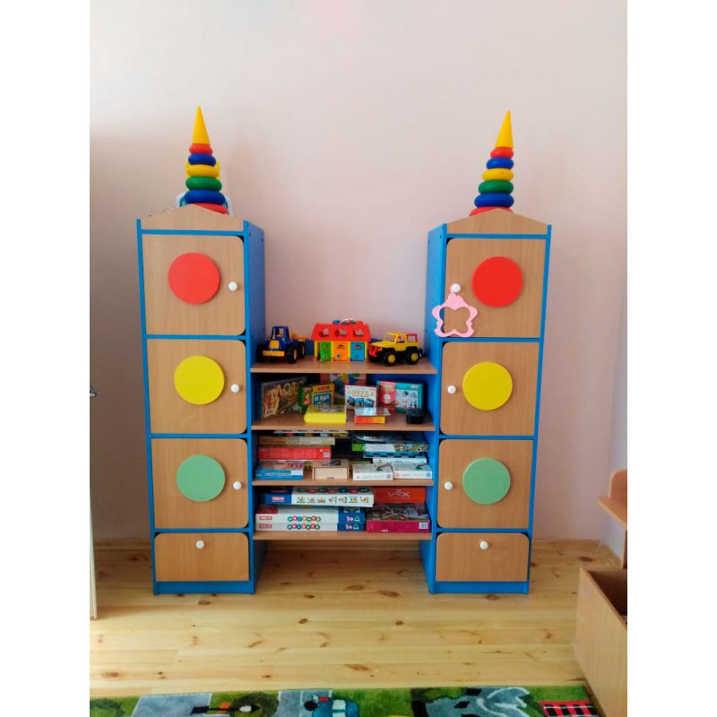 Стенка детская сделана в виде светофора, имеет несколько закрытых ящиков и множество удобных полок для игрушек. На этой стенке можно оформить уголок по правилам дорожного движения с методическим материалом