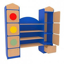 Стенка детская сделана в виде светофора, имеет несколько закрытых ящиков и множество удобных полок для игрушек. На этой стенке можно оформить уголок по правилам дорожного движения с методическим материалом.
