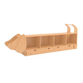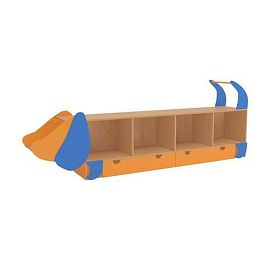 Дизайн стеллажа в виде веселой, яркой собачки Таксы привнесёт изюминку в интерьер Вашего детского сада. Стеллаж для детского сада «Такса» порадует Вас не только своей яркостью и оригинальностью, но и функциональностью. Он служит для хранения игрушек, в нём есть открытые полки и выдвижные ящики. Данная модель может быть исполнена в 2 вариантах: