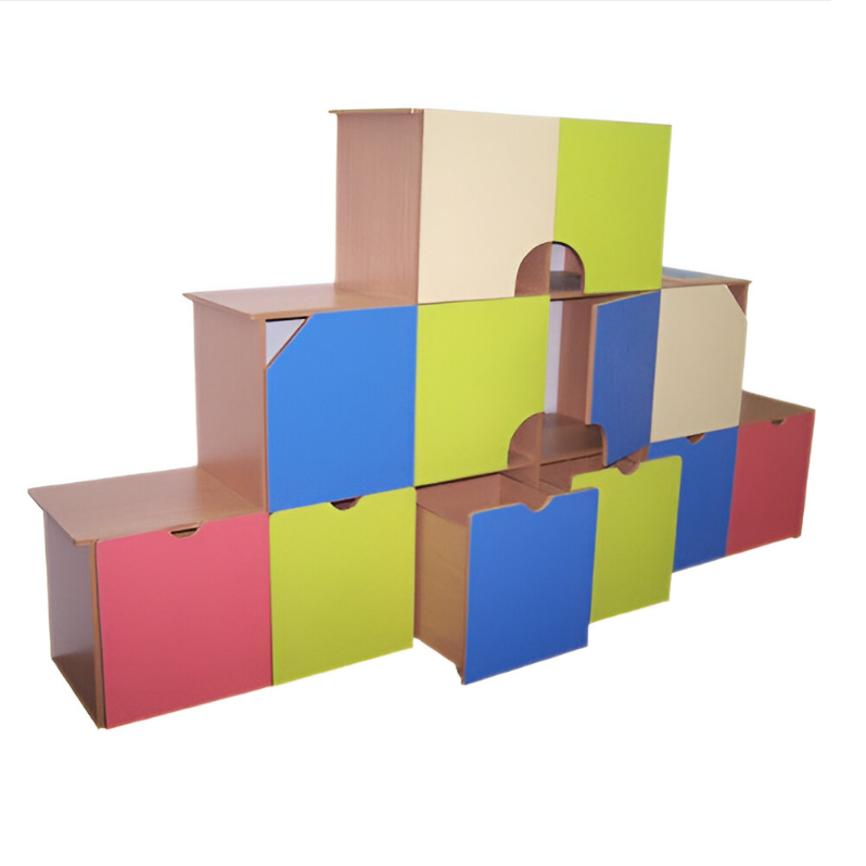 Описание: Основной цвет бук или кремовый. Фасады цветные по желанию заказчика. Стенка из трех ярусов в виде пирамиды. Первый ярус - это 6 выдвижных ящиков на колесах с фигурными разноцветными фасадами. Второй ярус уже, чем первый, состоит их 4 шкафчиков с закрытыми полками, дверки полок фигурной формы, разноцветные. Третий ярус - два шкафчика с разноцветными дверками фигурной формы. Верх крыши каждого яруса чуть выдается над самим ярусом, скругленные углы.