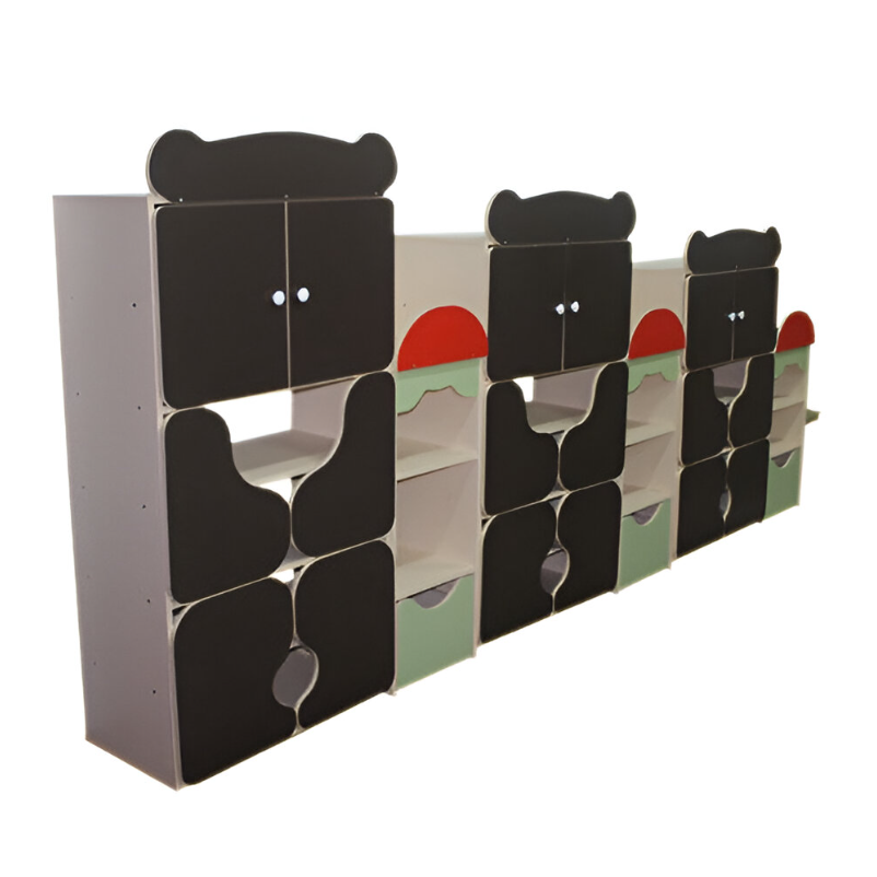 Описание: Основной цвет бук или кремовый. Фасады цветные по желанию заказчика. Стенка состоит из 3- стеллажей с фигурными дверками и трех стеллажей с открытыми полками, под которыми устанавливаются выдвижные ящики, размером 36*20 см. Первый стеллаж размер - 80*42*162 см., второй стеллаж - 80*42*147 см., третий стеллаж - 80*42*132 см., все с тремя парами дверок, за которыми по две полки. На верх стеллажей крепится фигурный элемент в виде ушек медвежонка. Стеллажи с тремя открытыми полками следующих размеров: 40*42*114 см, 40*42*104 см., 40*42*94 см. На верх модуля крепится декоративный элемент в виде шапочки. Все стеллажи соединяются между собой стяжками. Для обеспечения целостности покрытия пола, стеллажи устанавливаются на пластиковые подпятники.