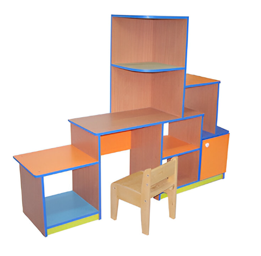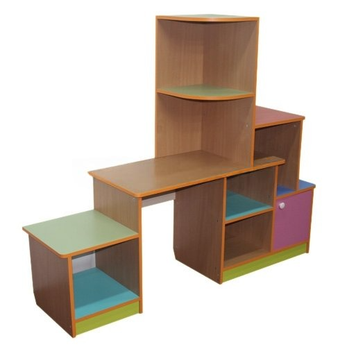 Описание: Стульчик на фото в комплект не входит, основной цвет бук или кремовый. Фасады цветные по желанию заказчика. Стол с одной открытой тумбой справа, с обеих сторон две дополнительные тумбы, одна открытая с левой стороны и закрытая с правой стороны, в этих тумбах по одной полке. На столешнице дополнительная надстройка с двумя полочками. все полки из цветного ЛДСП, задние стенки из ДВП.
