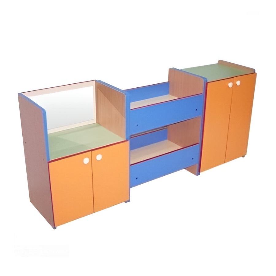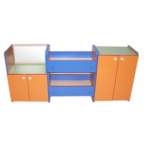 Описание: Основной цвет бук или кремовый. Фасады цветные по желанию заказчика. Стенка разделена на 3 секции: первая секция с закрытой тумбой с двумя дверками, с зеркальным элементом; средняя секция - 2-х ярусная кроватка для кукол; последняя секция с закрытой тумбой в высоту стенки с дополнительной полкой внутри. Задние стенки ДВП.