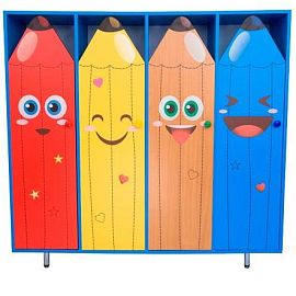 Оригинальным решением в дизайне шкафчика для детского сада являются цветные створки, выполненные в виде забавных карандашей. Такой вариант не только понравится деткам необычным дизайном, но и гармонично впишется в интерьер раздевальной комнаты.