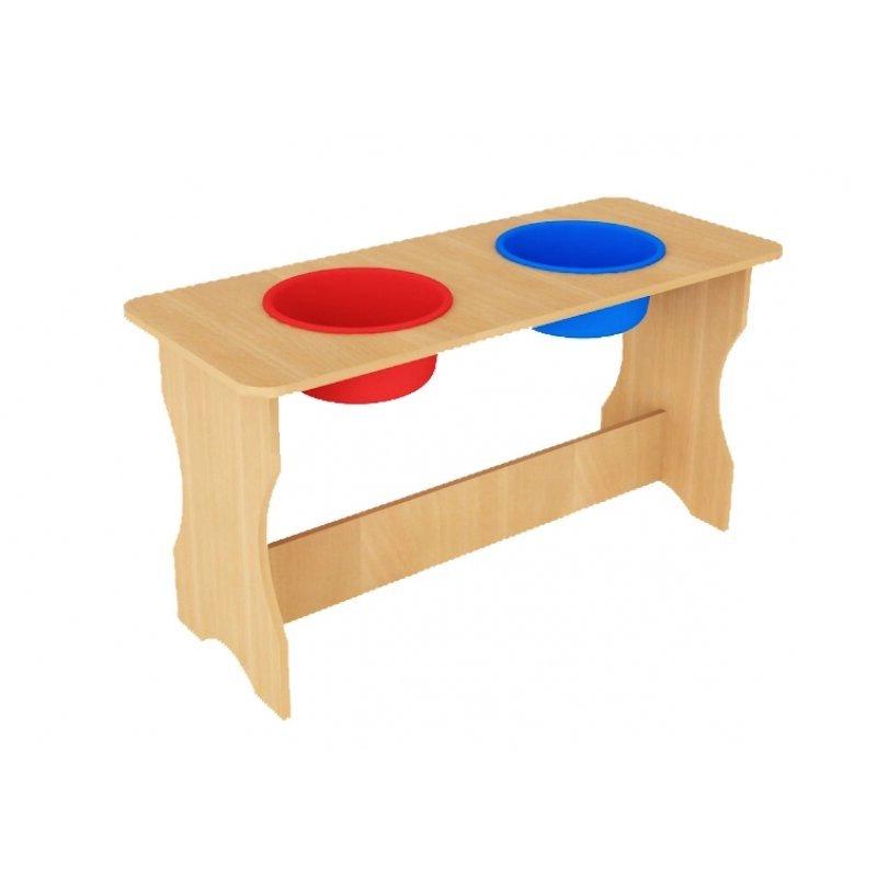 Столешница детского стола изготовлена из ЛДСП, благодаря чему сохранит исходный внешний вид под воздействием любых жидкостей, что важно для стола в детском саду. Для уборки тазы легко извлекаются, моются и помещаются на прежнее место.